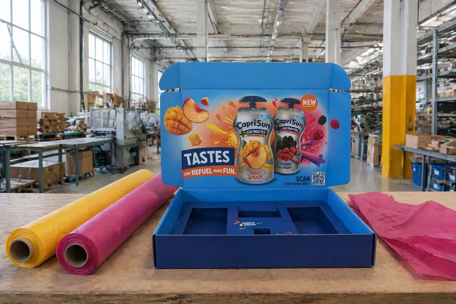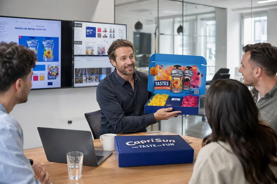 Für den europaweiten Launch eines neuen Produkts – eines mit Elektrolyten angereicherten Erfrischungsgetränks – suchte Capri Sun nach einer wirkungsvollen Möglichkeit, das Konzept gezielt im Rahmen einer PR- und Kampagnenstrategie zu platzieren. Ziel war es, die Marke in einem neuen Kontext zu positionieren und eine jüngere, sportlich orientierte Zielgruppe anzusprechen. Mit „Capri Sun mit Elektrolyten“ sollte bewusst ein Schritt in Richtung funktionaler Getränke gegangen werden – verbunden mit Attributen wie Aktivität, Fitness und einem moderneren, gesundheitsbewussten Lebensstil. Diese neue Markenbotschaft sollte sich konsequent in der Präsentation widerspiegeln. Im Fokus standen dabei zwei zentrale Multiplikatorengruppen: Influencer, Foodblogger und Social-Media-Akteure auf der einen Seite sowie Einkäufer und Entscheider im Handel und internationale Distributionspartner auf der anderen. Entsprechend hoch waren die Anforderungen: Die Präsentation musste emotional aktivieren, gleichzeitig aber auch professionell und überzeugend im B2B-Kontext funktionieren. Die konkrete Aufgabe bestand darin, ein Präsentationskonzept zu entwickeln, das mehrere Elemente hochwertig vereint: Neben den Getränkeproben sollten auch gebrandete Goodies wie ein Fitnessband und Sportsocken integriert werden – alles eingebettet in ein stimmiges Gesamtbild. Eine besondere konstruktive Herausforderung stellten dabei die Produkte selbst dar: Die typischen Trinkpouches sind weich, druckempfindlich und forminstabil – und damit schwer sicher und gleichzeitig ansprechend zu präsentieren. Zusätzlich galt es, ein klar definiertes Budget einzuhalten und einen sehr engen Zeitrahmen von nur rund drei Wochen umzusetzen. Insgesamt etwa 500 individuell bestückte Präsentationsboxen mussten produziert, konfektioniert und europaweit an rund 50 unterschiedliche Empfänger versendet werden – von Einzeladressen bis hin zu Sammellieferungen für internationale Märkte. Auch logistisch war das Projekt anspruchsvoll, etwa durch den Versand in abgelegenere Regionen wie Island oder die Färöer-Inseln, für die spezielle Versandlösungen inklusive Luftfracht organisiert werden mussten.